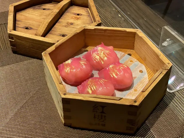 色彩鮮艷的香檳金蝦餃,外皮軟彈,蝦肉大隻彈牙,質素很好。