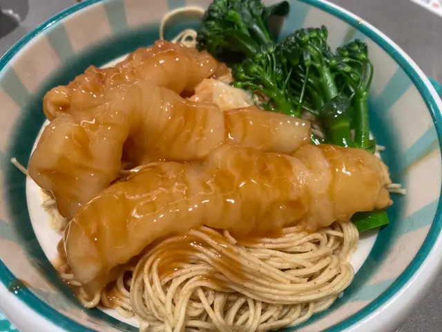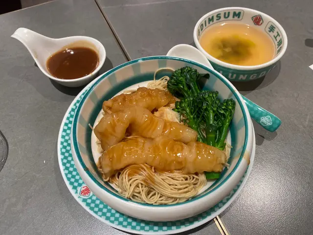 麵底揀左蝦籽麵,估唔到花膠相當足料,口感彈牙,充滿骨膠原。另有附上湯及鮑魚汁,上湯有韮黄及蝦籽,味道清甜,又有淡淡韮黃清香,而鮑魚雞汁濃厚,味道突出,撈麵食十分惹味。