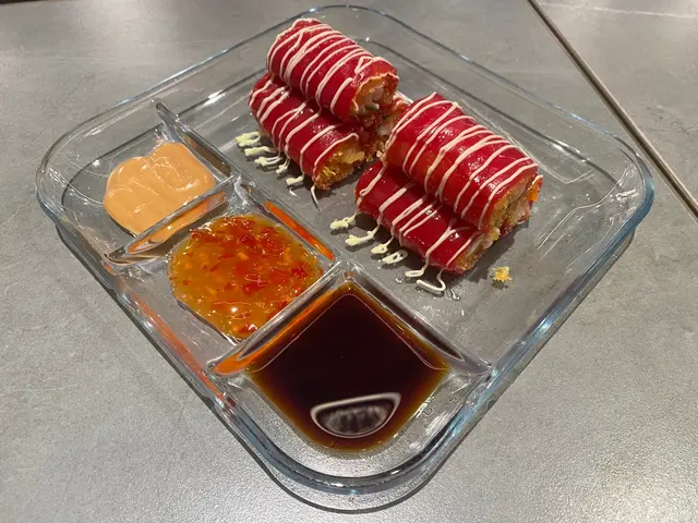 有三個醬料可以選擇沾點,分別是泰式辣醬、花生醬及甜豉油。紅米腸粉顏色奪目,入面包左的金黃色的脆脆,令腸粉的層次更豐富,同時最中間包的蝦爽口,整體食落好有層次感。