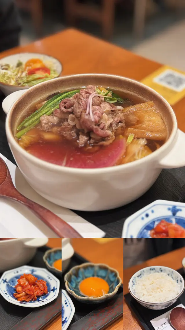 牛肉唔厚但好大塊,脂香同肉味平衡,入口嫩滑。壽喜燒湯底甜鹹適中,而且吸晒牛肉同蔬菜嘅鮮味,係有層次嘅湯底配。套餐仲有前菜同小食,食落層次感豐富。