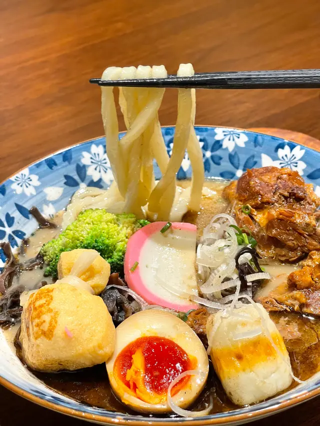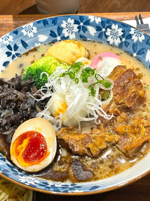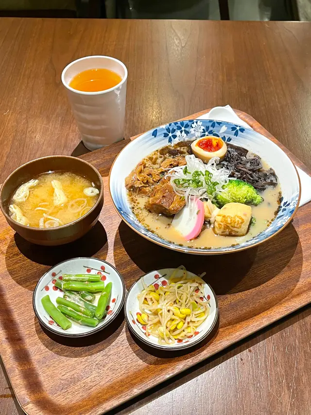 野菜豬軟骨黑蒜油豬骨濃湯烏冬:豬軟骨慢煮到軟腍,豬骨濃湯湯底味道濃郁帶有黑蒜油的香氣,烏冬口感爽口彈牙,整體配料豐富,有醬油溏心蛋、蛋福袋、木耳絲、西蘭花、蜆和獅子狗等,味道層次豐富且有新鮮感。
