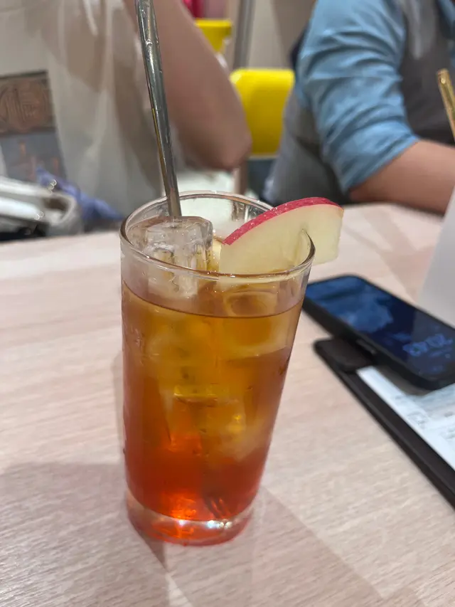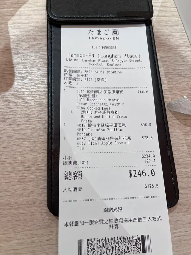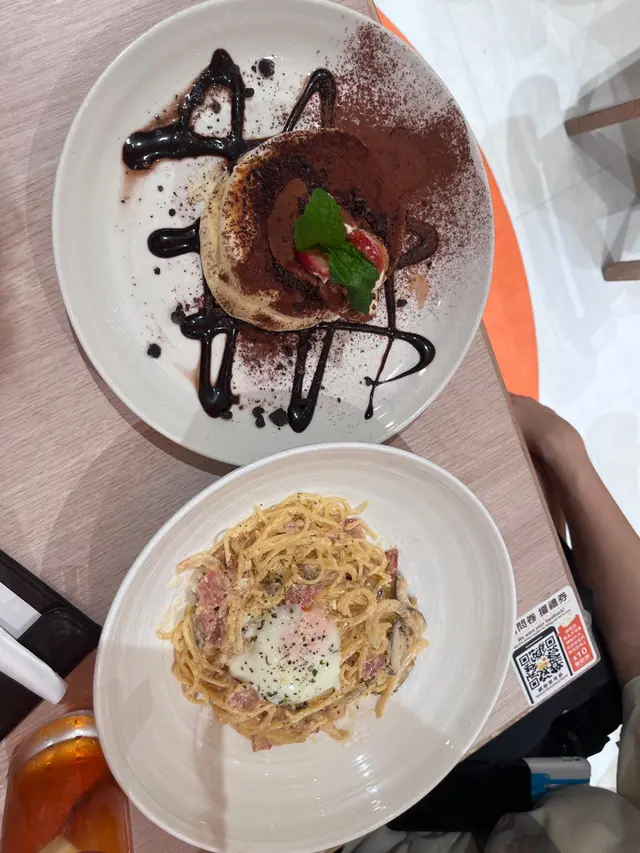 疏乎厘班戟(約HK$88)外觀蓬鬆如雲,輕盈的蛋香撲鼻而來。切開時,班戟柔軟彈嫩,搭配濃郁的奶油和微甜的糖霜,入口綿密,甜度適中,令人回味無窮。明太子忌廉意粉(約HK$108)以幼滑的忌廉醬汁為基底,點綴鹹香的明太子,意粉煮得恰到好處,彈牙有嚼勁。明太子的鮮味與忌廉的濃郁完美融合,味道層次豐富,惟稍嫌醬汁略濃,或許更清爽會更討好。蘋果茉莉花茶(約HK$38)清新怡人,蘋果的果香與茉莉花茶的淡雅花香交織,解膩之餘為整餐增添一抹清爽。