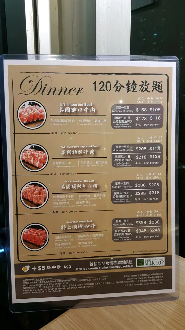 牛肉🐂選擇方面有4款,價錢都有唔同,最普通嘅有美國進口牛肉,跟住係美國特選牛肉、美國頂級牛小排同埋特上澳洲和牛。我哋揀咗第三級別嘅美國頂級牛小排,仲有埋海鮮放題(蠔、蝦🦐、帶子)添。另外仲會包埋豚肉同雞肉🐔,如果想升級食日本鹿兒島頂級黑豚,加少少錢就食到。