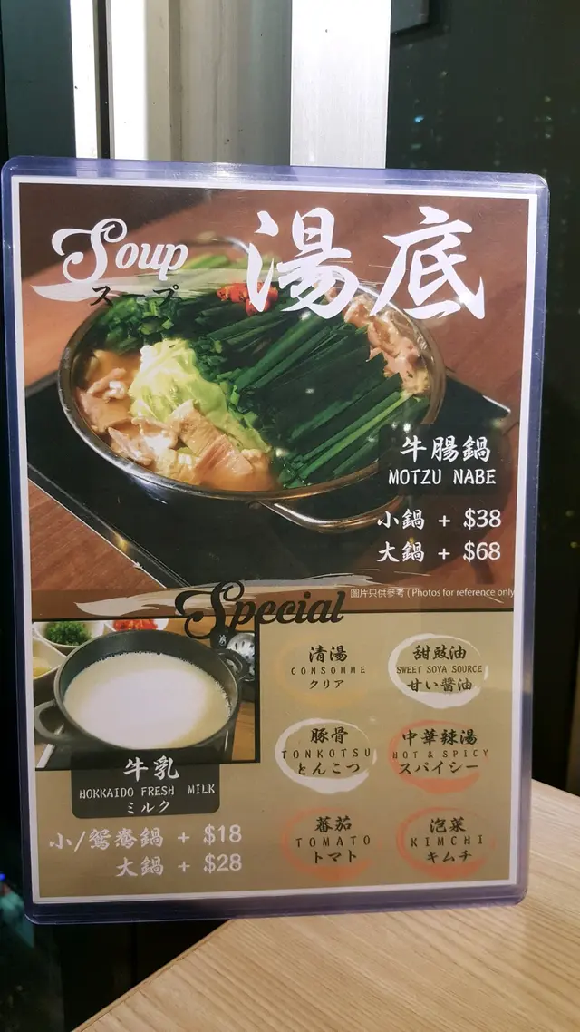 呢度都有好多款湯底,清湯、甜豉油、豚骨🐖、中華辣湯、蕃茄🍅、泡菜、牛乳🐄、山盛香菜鍋、赤辣豚骨湯底、鍾意食蠔就必點嘅廣島蠔土手鍋、黑蒜豚骨湯底同埋日本福崗十大必吃美食-牛腸鍋🐂。咁多款心思思,真係好難揀,不過唔緊要,呢度可以加錢嗌鴛鴦鍋🥘,咁我哋揀咗個黑蒜豚骨湯底同埋好難得先食到嘅日本福崗牛腸鍋。