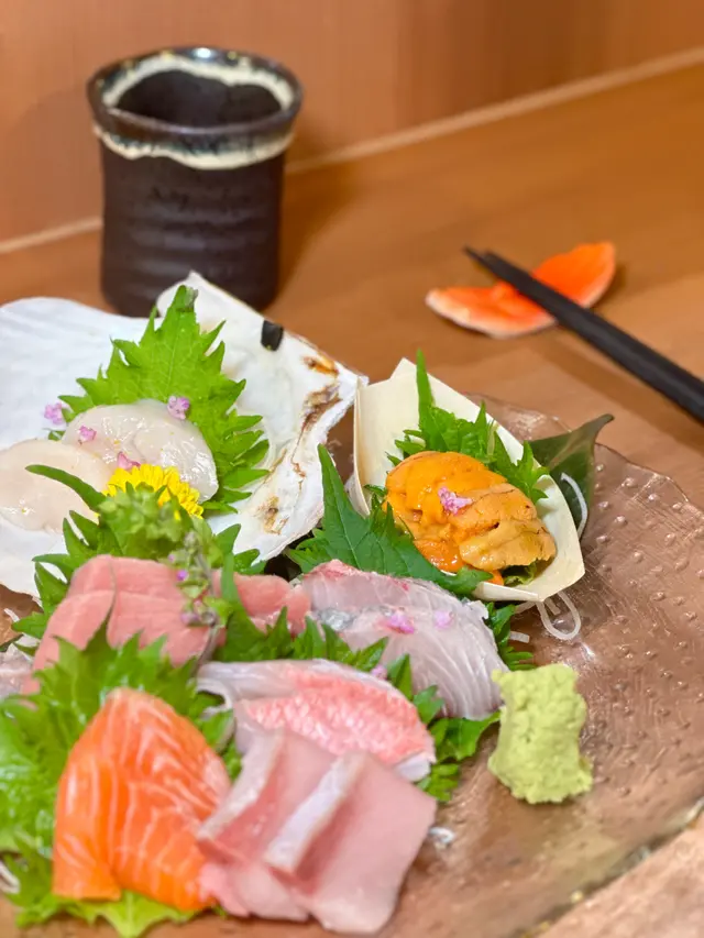刺身款式相當豐富,包括蜜柑鯛、紅富士三文魚、油甘魚、金目鯛、深海池魚、海膽、中拖羅及新鮮帆立貝,全部刺身都新鮮肥美~