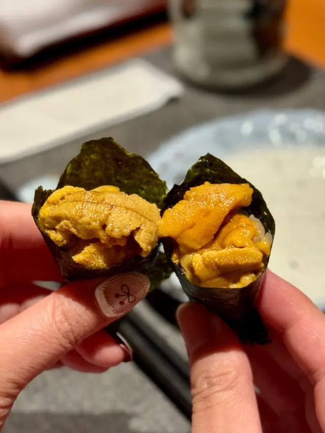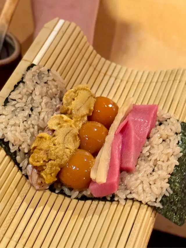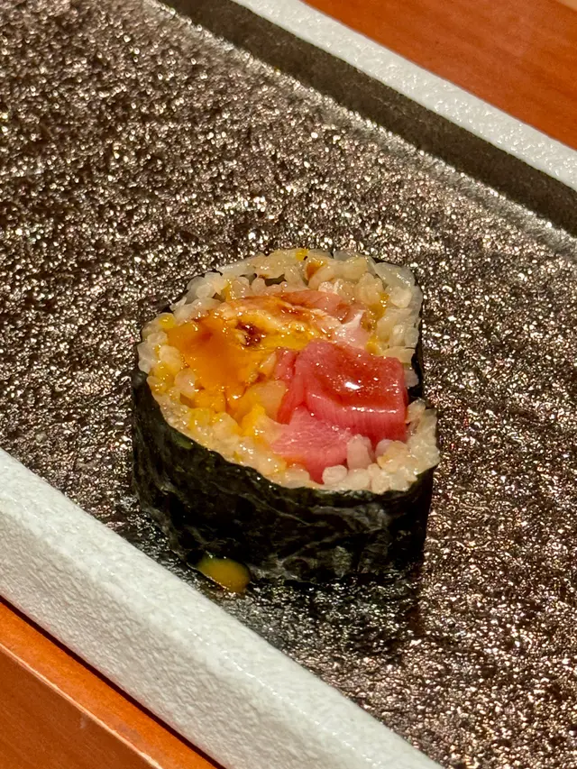 賣相吸睛嘅卷物😍!材料有熟成大拖羅、海膽、金黃蛋黃等,口感豐富有層次。