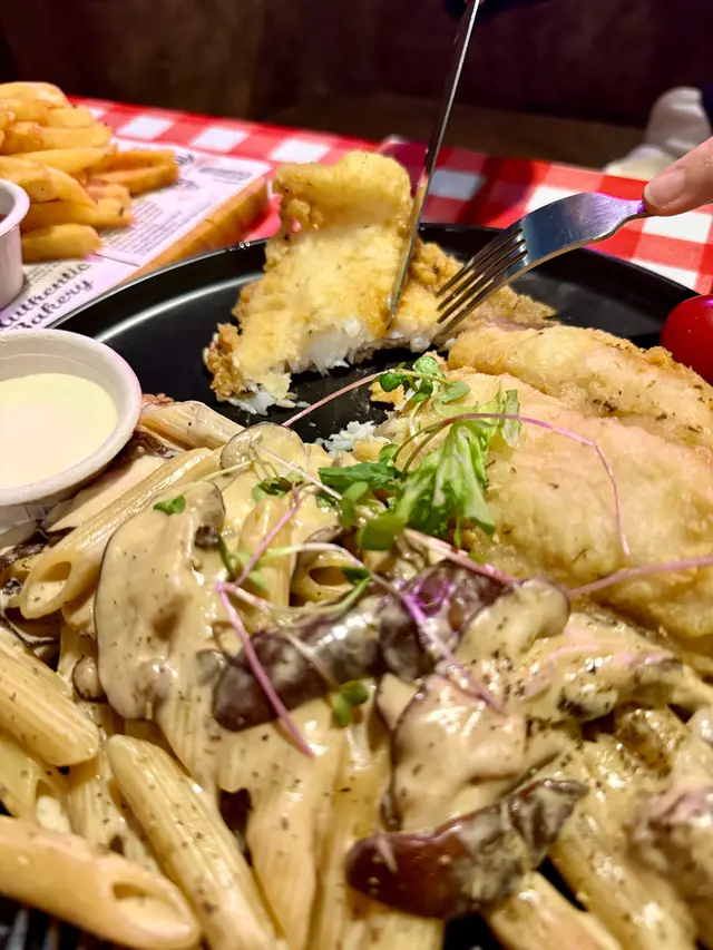 龍脷柳長通粉嘅魚柳炸得幾香脆,唔油膩,肉質嫩滑,唔會粉粉地,通粉creamy,帶少少芝士味。