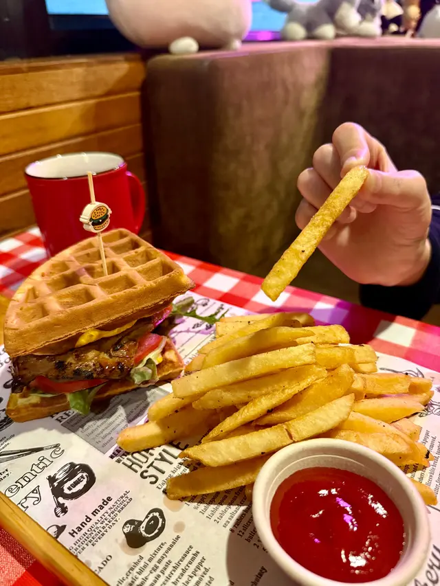 雞扒窩夫漢堡都幾特別,唔係普通包,而係用窩夫夾住塊雞扒,啲窩夫唔會過甜,帶少少蛋香,口感外脆內鬆軟,加埋煎得微焦嘅雞扒,啖啖肉汁,仲有少少蜜糖芥末醬調味,味道好好,係個創新嘅搭配!