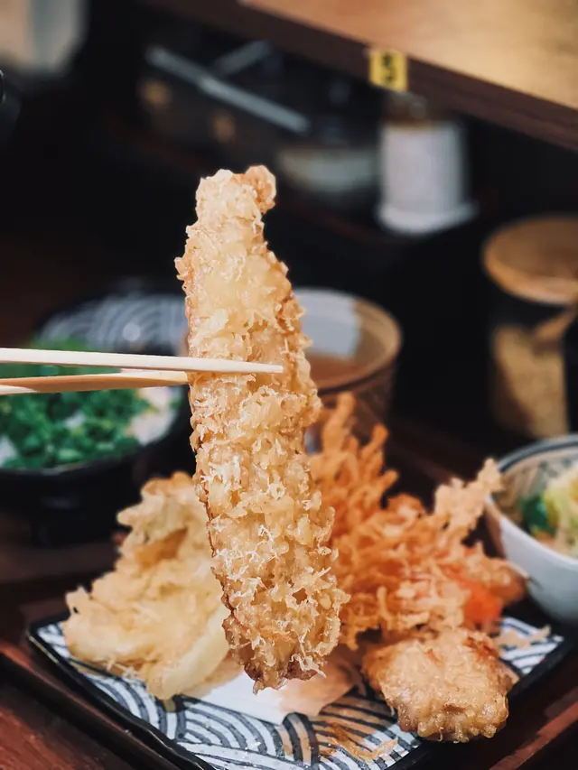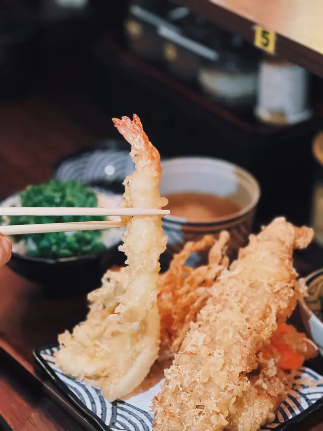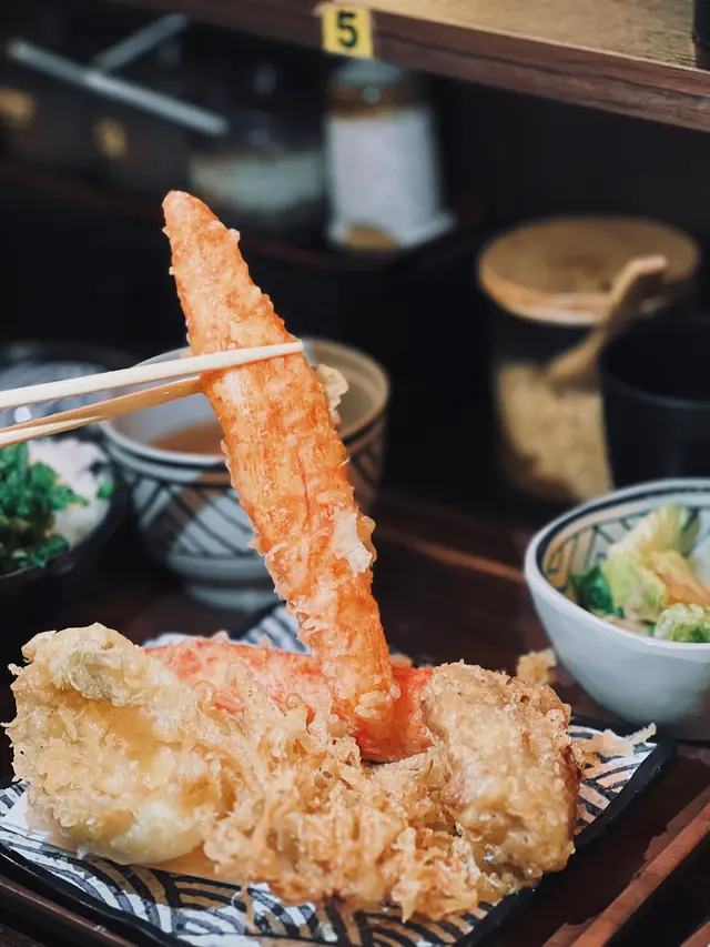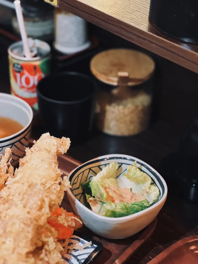 最正係呢度有自選天婦羅定食,只係$30起,真係勁抵食🔥!岩晒有選擇困難症既人,可以樣樣都叫黎食。我地飯底+$8轉左香蔥牛油飯,爆多蔥粒鋪係飯上面,加埋牛油香,撈勻之後每一啖都充滿蔥香同油香,未食餸都扒左半碗飯🍚。天婦羅方面,穴子+$22必叫,成大條上碟,魚肉好綿密;珍寶蟹柳+$18真係珍寶size,絲絲分明好有口感🦀;鱚魚+$18我都係第一次食,魚味幾鮮甜,口感好滑;黑虎蝦+$12爽口彈牙,炸漿夠薄;雞肉+$12嫩滑吾柴;金菇+$8炸到好似扇咁,咬落去脆卜卜好過癮🍄。