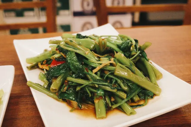 同朋友2個人叫左阿來既 燒豬頸肉/ 火山軟殼蟹法包/ 馬拉盞炒通菜