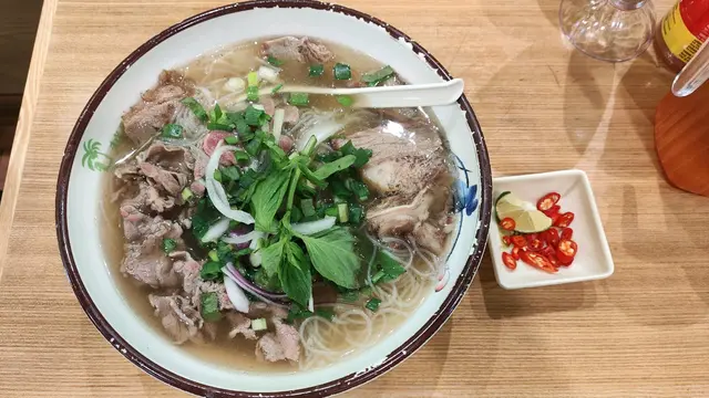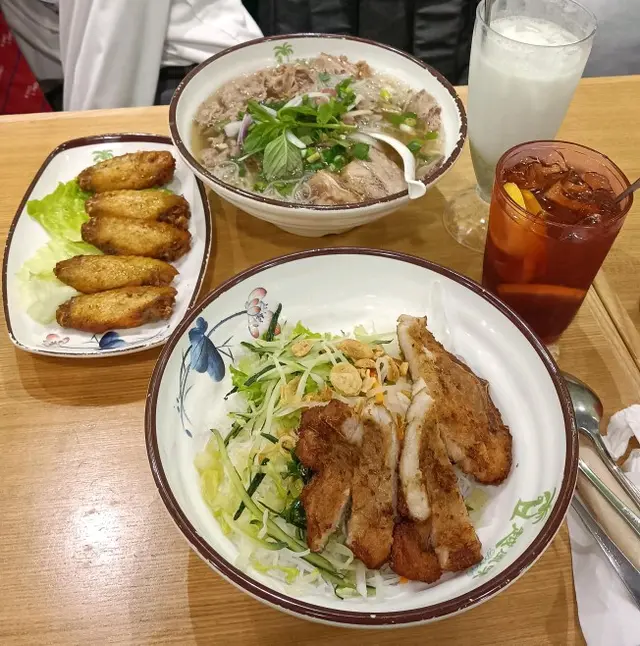 生牛+熟牛湯檬:湯底用左牛骨和香蔥、芫茜、洋蔥等香料熬製而成,牛骨味道濃郁,清甜好喝,檬粉煮得恰到好處,又滑又薄又索湯,生牛肉呈粉紅色,在熱湯裡慢慢變色,食起上嚟,肉質鮮嫩,牛味突出,食越南菜必點。