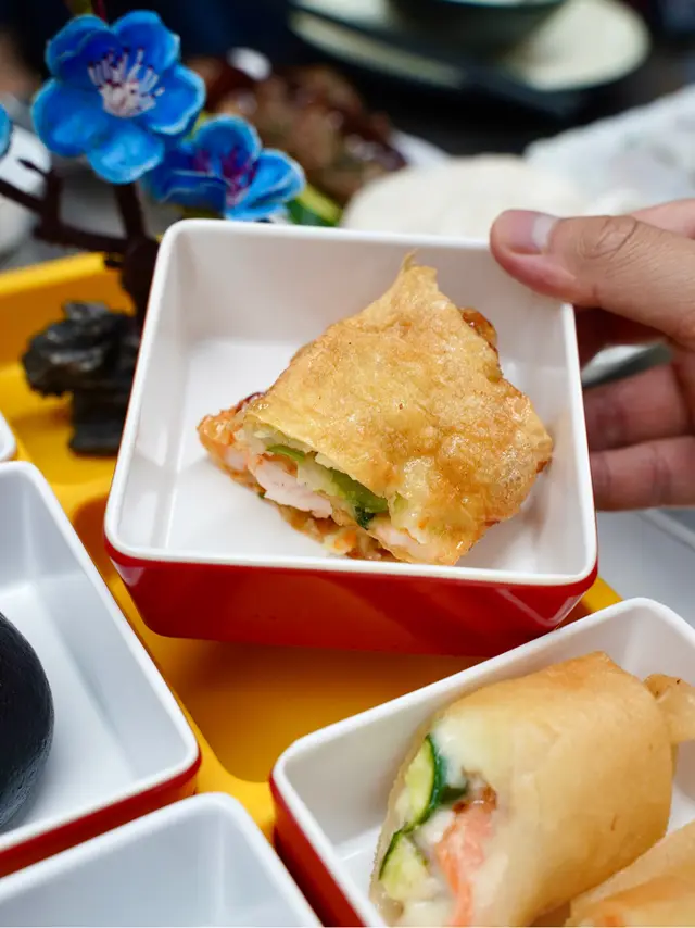 佢哋最近就2:30-6:00時段出咗一個一人餐,$61就可以食到八款點心,有鮮蝦餃、灌湯小龍包、瑤柱杞子燒賣皇、竹炭熔岩奶皇包等。蝦餃入面蝦仁食落爽口,燒賣係平時少見瑤柱杞子配豬肉,食落多汁好味。而三文魚春卷同腐皮卷都做到非常香脆,咬肉脆卜卜👍🏻,三文魚春卷意外地足料。