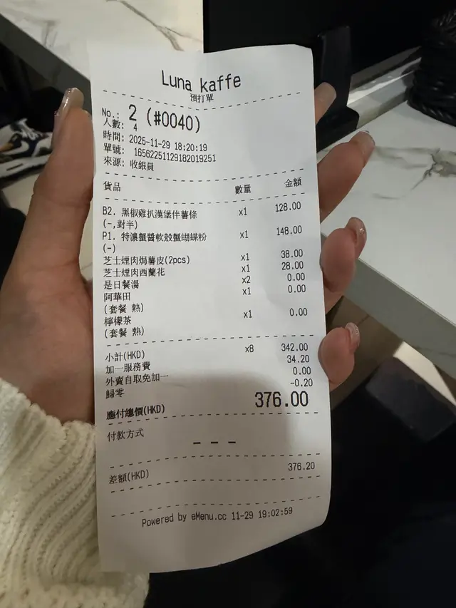 旺角隱世西餐小店,滋味滿分又超親民! iloveyum等級32025-12-01 關注 呢間Luna Kaffe真係旺角女人街附近嘅 hidden gem呀!環境又靚又舒服,好啱我哋呢啲鐘意悠閒食嘢嘅女生。今日我叫咗幾樣招牌,先講呢份黑椒雞扒漢堡伴薯條,漢堡超大份,雞扒炸得香脆,入面多汁又唔油膩,黑椒醬香味濃郁,咬落好滿足!配搭嘅薯條炸得金黃酥脆,好完美嘅搭配,真係一試就愛上。另外我仲試咗特濃蟹醬軟殼蟹蝴蝶粉,蝴蝶粉拌滿濃郁蟹醬,軟殼蟹炸得酥脆,味道又香又鮮,層次好多,好味到唔想停口。芝士煙肉焗薯皮就係我嘅心頭好,兩件裝,薯皮外酥內軟,芝士同煙肉配搭好香,好邪惡但又忍唔住再點一次。今次仲叫咗個餐湯,忌廉粟米湯,好滑好香,完美暖胃!飲完仲點咗檸檬茶,清新解膩,整個餐都好滿足。呢度嘅食物用料實在,味道又正,價錢仲好親民,完全係旺角區嘅平價西餐天堂!每次嚟都覺得新鮮又好味,好期待下次再嚟探索更多美味呀!12以上食評乃用戶個人意見 , 並不代表OpenRice之觀點。讚好分享旺角隱世西餐小店,滋味滿分又超親民! Luna Kaffe https://s.openrice.com/QrbT0w6HV00檢舉 張貼 評分5味道5環境5服務5衛生5抵食用餐途徑堂食