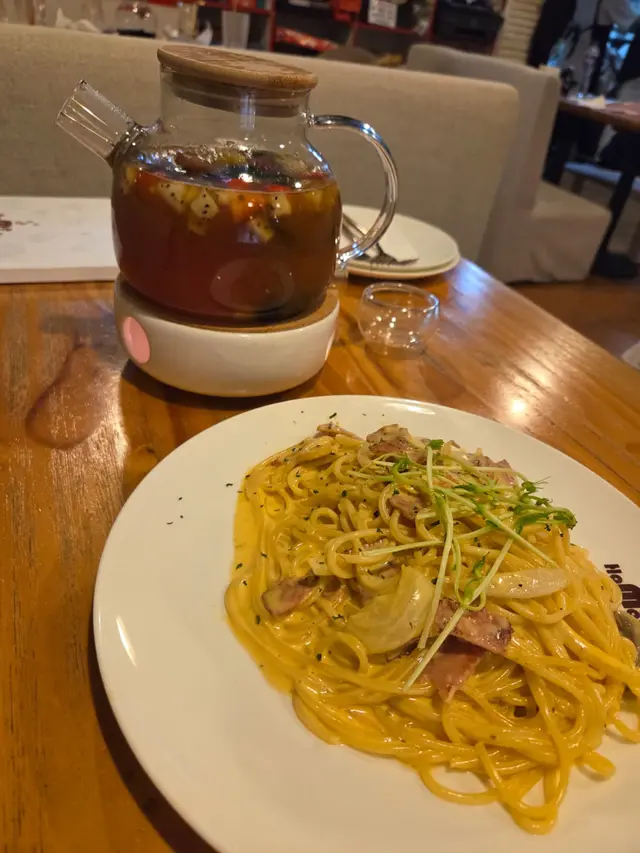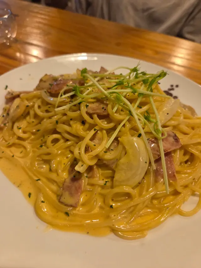 跟住係卡邦尼意粉~ 醬汁真係做得夠晒creamy!每條意粉都掛滿蛋香同芝士香,仲有煙肉嘅鹹香做點綴。最驚喜係佢哋加咗少少蘑菇,多咗重口感之餘,仲平衡返個膩感。雖然唔係好傳統嘅做法,但味道絕對收貨!