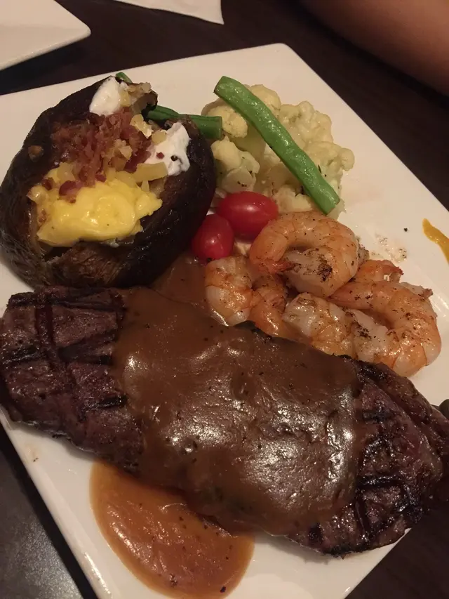 牛扒海鮮對對碰 - 牛扒叫左七成配黑椒汁..同配蝦.焗薯(可簡薯蓉)