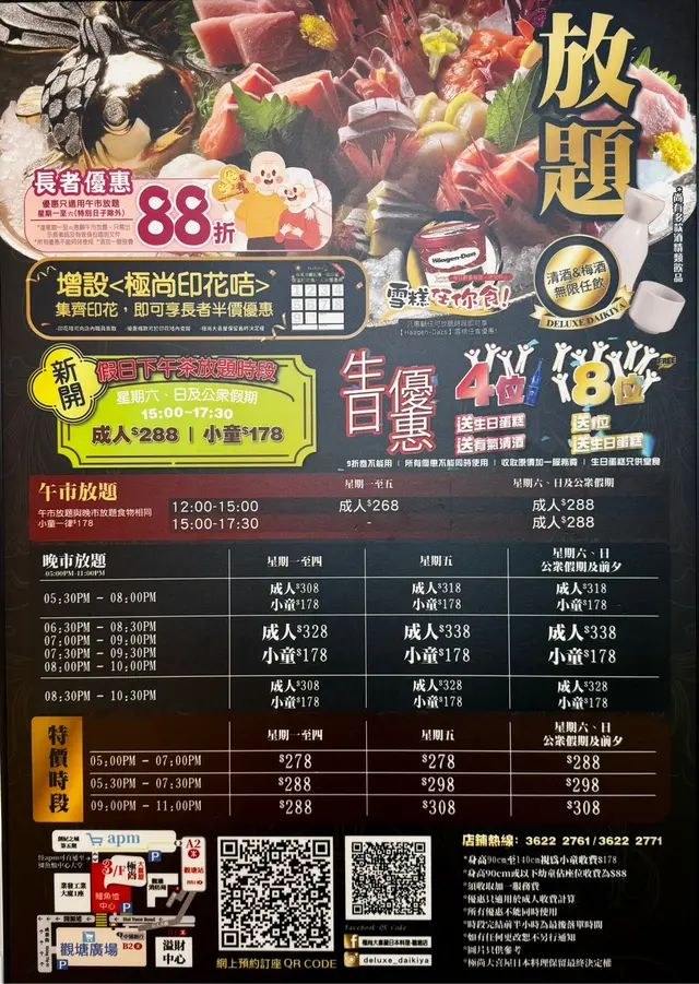 晚市放題 - 特價時段$288 hwlok等級32025-12-03 關注 觀塘極尚大喜屋晚市放題特價時段有3個:1)5:00pm-7:00pm2) 5:30pm-7:30pm3) 9:00pm-11:00pm64剛好相約朋友食放題當天晚上,朋友收工較晚,所以最後決定食9:00pm-11:00pm 這段特價時段之前去過旺角極尚大喜屋,觀塘這間極尚大喜屋,餐廳環境裝修更時尚,地方更寬敞舒適大喜屋放題一如既往,食物款式都是多款高質。由於我已經好耐無食過大喜屋放題,這次發現放題多了許多矜貴中菜食物款式,例如:金湯花膠、蟶子王和蟹粉扒豆苗等等,味道也很好吃日式刺身醉鮑魚金湯花膠XO醬蒜蓉粉絲蒸蟶子王蟹粉扒豆苗鐵板香煎肝多士日式炸物以上食評乃用戶個人意見 , 並不代表OpenRice之觀點。讚好分享晚市放題 - 特價時段$288 極尚大喜屋 (鱷魚恤中心) https://s.openrice.com/QrbT0BN5V00檢舉 張貼 評分5味道5環境5服務5衛生5抵食用餐途徑堂食