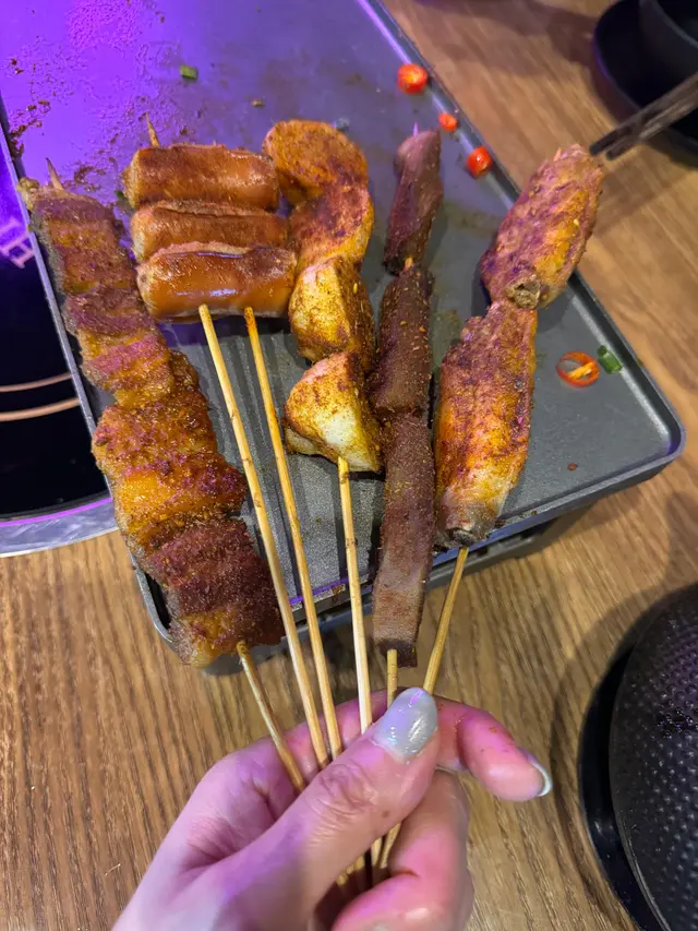 串燒全部都少辣,口味適中,燒得均勻,都是四川風味。墨魚丸蛋呀,五花腩肥瘦均勻。