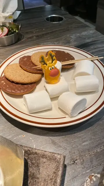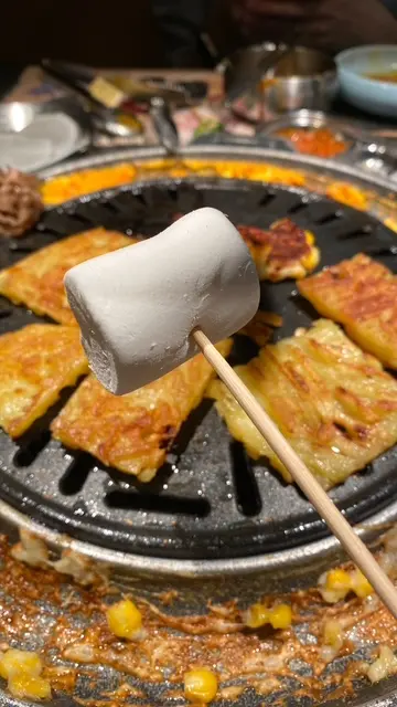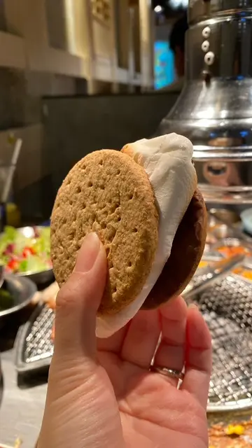 先將棉花糖燒軟,夾著威化餅,像是漢堡包甜版,入口即化,甜甜的感覺滿足了甜點的胃 。