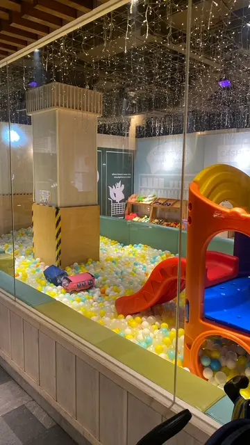 最吸引小朋友的,是餐廳中央的一個巨大的波波池。五彩繽紛的塑膠球堆成一片海洋,小女兒一看到就興奮得跳了進去,我和朋友一邊期待今晚的燒肉饗宴。