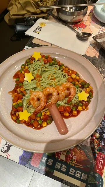 比較特別嘅事開心果醬意粉,拼成了聖誕樹的模樣,加上蘑菇,蟹籽,蝦仁,粟米粒,紅蘿蔔與意粉完美融合,孩子吃得津津有味。