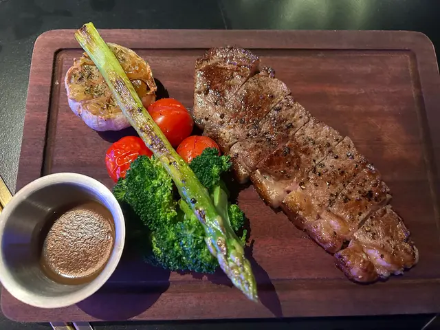 這道菜以烤美國黑安格斯西冷牛扒為主,搭配了紅酒燒汁。黑安格斯牛肉具有優質的質地和豐富的肉汁,烤製後非常多汁和美味。紅酒燒汁的酒香和濃郁的口感能與牛肉完美融合,為整道菜帶來豐富味道。