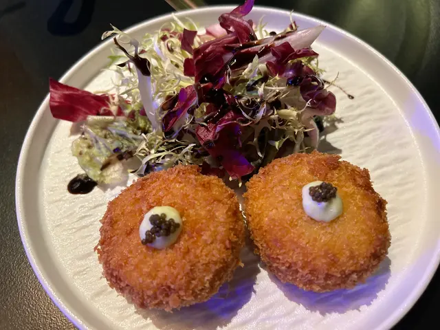 這道菜結合了意式焗蟹餅、青芥未蛋黃醬和黑魚子,口感非常豐富。蟹餅酥脆,內部有蟹肉的鮮甜味道。青芥未蛋黃醬的辛辣和蛋黃的濃郁應該能平衡蟹餅的味道,而黑魚子則為整道菜增添了豪華感。