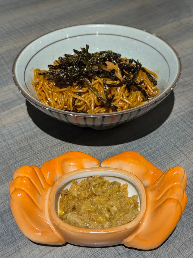 $198「蟹粉拌麵」:蟹粉放響一個蟹型嘅小兜裏邊而麵就放喺個碗裏邊,分開上,賣相幾好玩🤩;蟹粉份量都幾多,味道濃郁🤣;麵本身就好似係蔥油拌麵咁款,有好香嘅醬油同埋油炸香蔥味,再撈埋蟹粉,簡單講:好食🤣