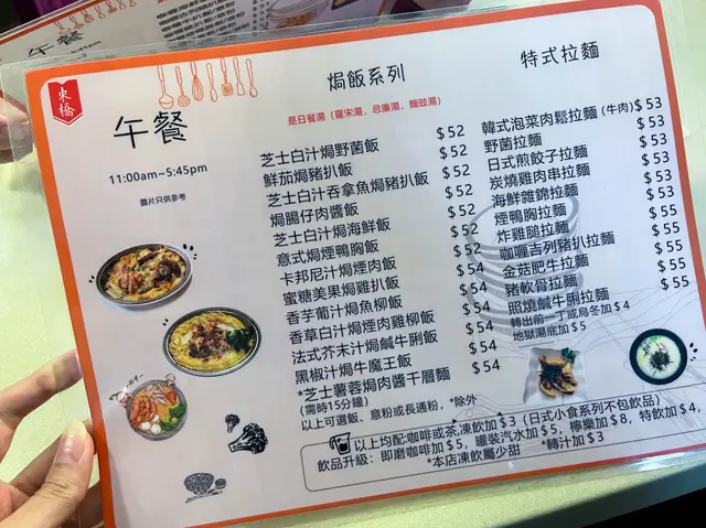 餐飲配咖啡或茶不需再加錢,凍飲要+$3,