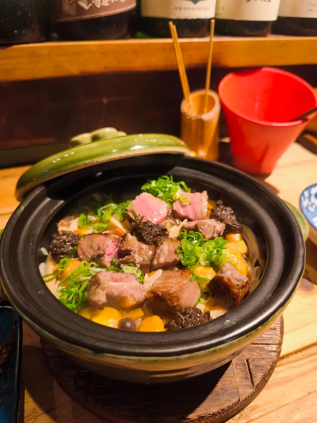 🍲最印象深刻係個初秋・和牛・栗子・野菌釜飯(小),一打開蓋已經香到暈~原來係黑松露醬!!和牛嫩滑,栗子同野菌增加咗口感同層次,飯吸晒啲精華,仲要煮到有飯焦,脆卜卜,我同朋友都搶住食!我嗌多咗個辣味筍,用嚟撈飯十分惹味!🥰👍🏻