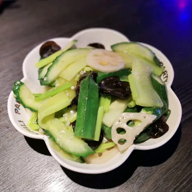 炒五素:芹菜、蓮藕、青瓜、黑木耳和秋葵為主要材料,色彩豐富,營養均衡,味道鮮美可口。是一道既健康又美味的素食料理。