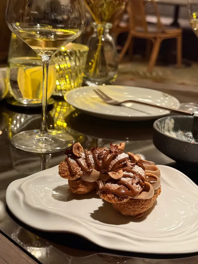 甜品完全是法式經典之物.法式薄餅與柑橘類金桔製成的雪葩結合.傳統環形泡芙內餡使用了榛果和果仁糖,甜美誘人!再者,愛酒之人不妨參考下駐場侍酒師推介,令餐點更完美極致.當中紅酒香醇飽滿,結構和諧.配搭最令人驚喜的Desert wine風味複雜,帶有橙皮、蜂蜜、杏子等香氣,有別於一般甜酒只有單一甜度.