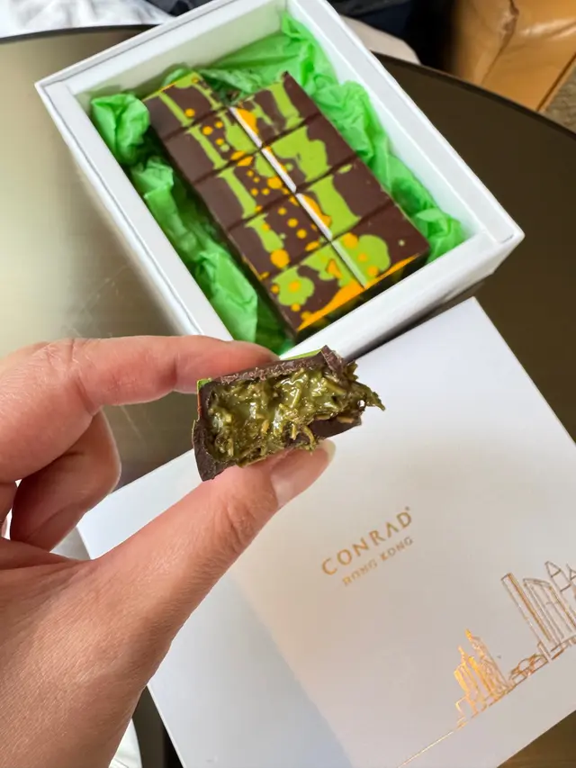 佢仲送成排杜拜開心果朱古力,好足料,第一次食,中間嘅脆脆米好香口,有質感,開心果味超濃,類似開心果醬,不過食咗一粒仔已經好漏。