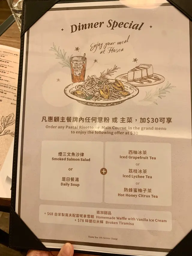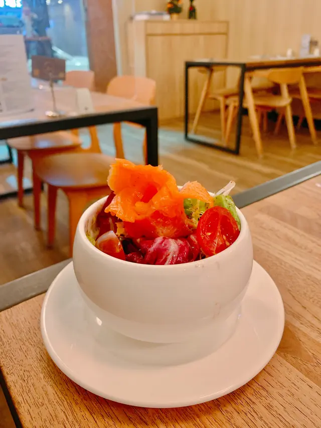 煙三文魚沙律(跟餐$30),玫瑰花型煙三文魚口感厚切,食落煙燻味道厚重,沙律菜包括有紫椰菜、羅馬生菜、苦菊、車厘茄,配以意大利油醋汁食用,味道清爽。