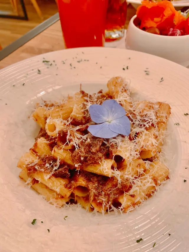 慢煮牛面頰粗管通心粉配巴馬臣芝士(單點$188),表面鋪滿即刨巴馬臣芝士絲,牛面頰肉肉質嫩滑,牛味濃厚,略嫌肉質太過細碎,粗管通心粉容易掛汁。