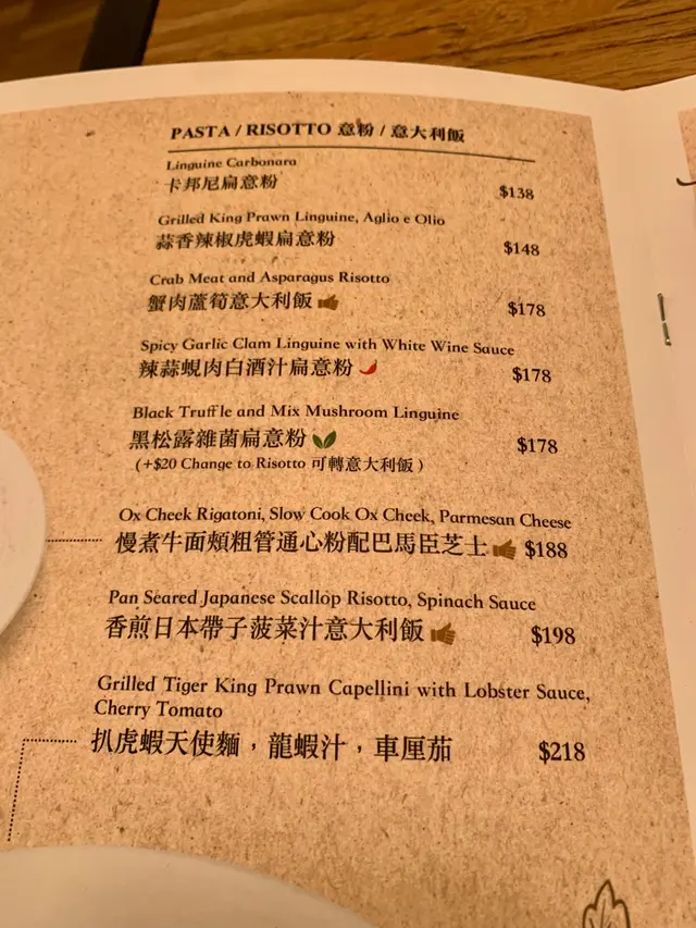 扒虎蝦天使麵龍蝦汁車厘茄(單點$218),表面鋪有辣椒絲,虎蝦肉質爽口,味道鮮甜;天使麵口感軟硬適中,略嫌龍蝦汁口感稀身、味道未夠濃郁,內有雜菌、香葉,略嫌沒有車厘茄。