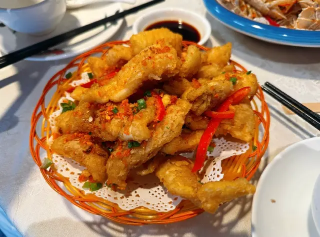 嚼勁十足卻不橡膠 鮮甜汁水被鎖在裡面椒鹽的咸、辣椒的微辣、蒜粒的焦香層層遞進簡單的菜最難做好