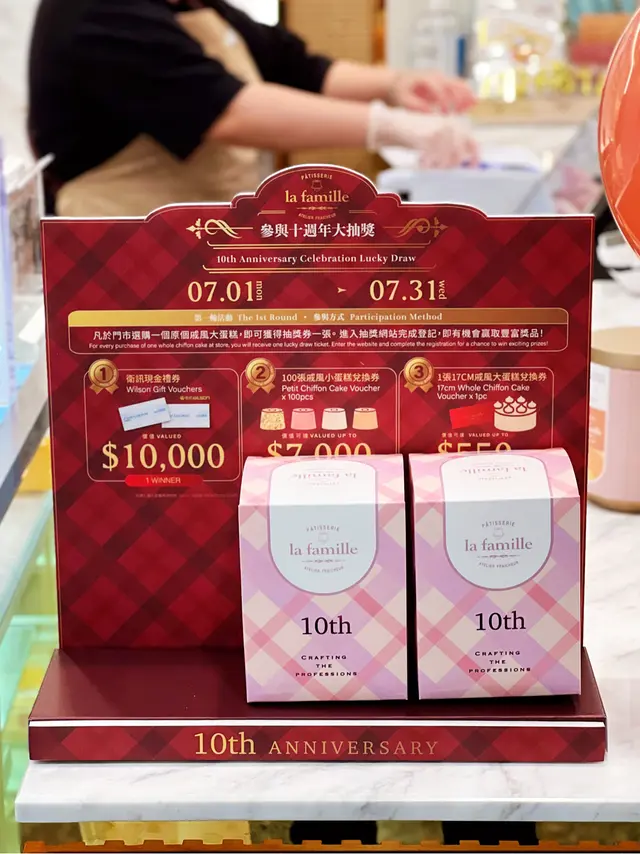 門市預訂/購買一個原個戚風大蛋糕,即可得到十周年禮盒,內有抽獎券、小蛋糕換領券 (可到店換一個$70或以下的小蛋糕) 及小熊造型毛巾