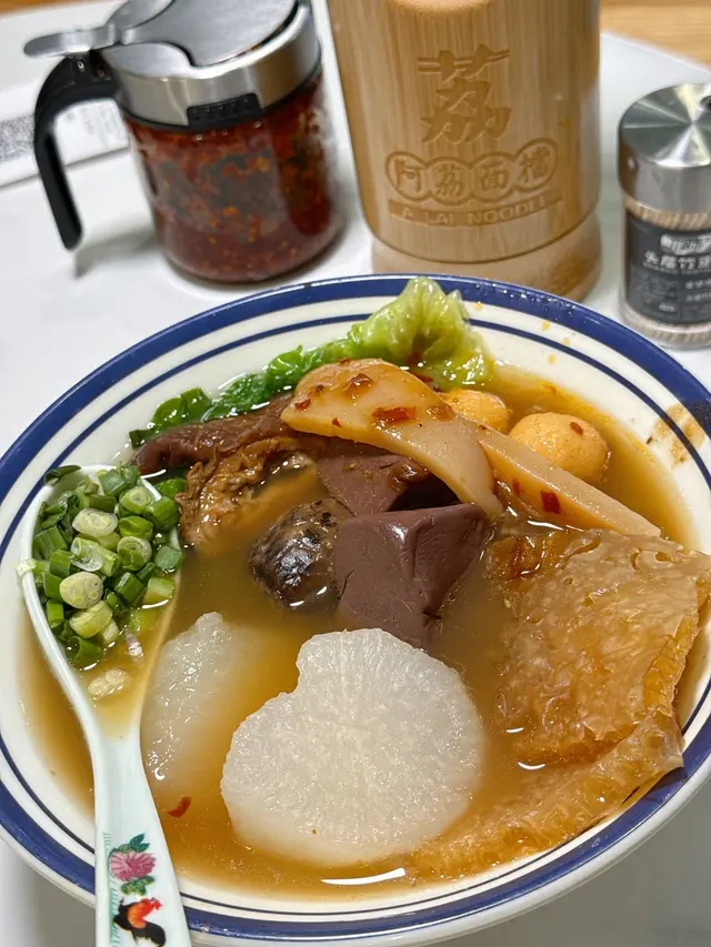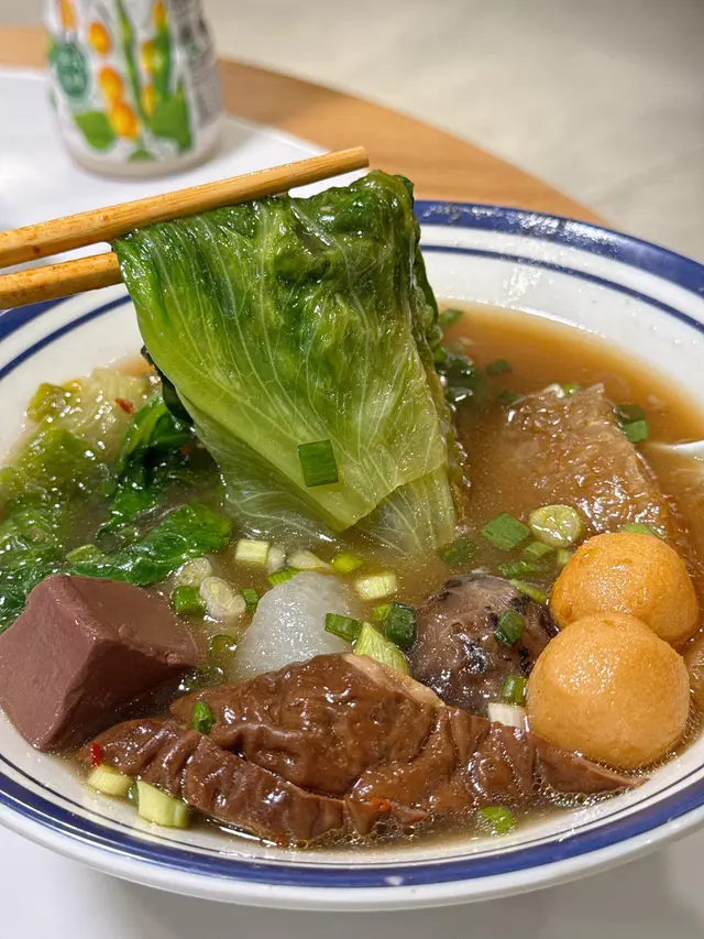 大大碗配料豐富 玻璃辣魷魚爽口彈牙🦑大腸清洗乾淨無異味 轉生菜底更加健康🥬配上牛腩汁香濃惹味好夾🐮