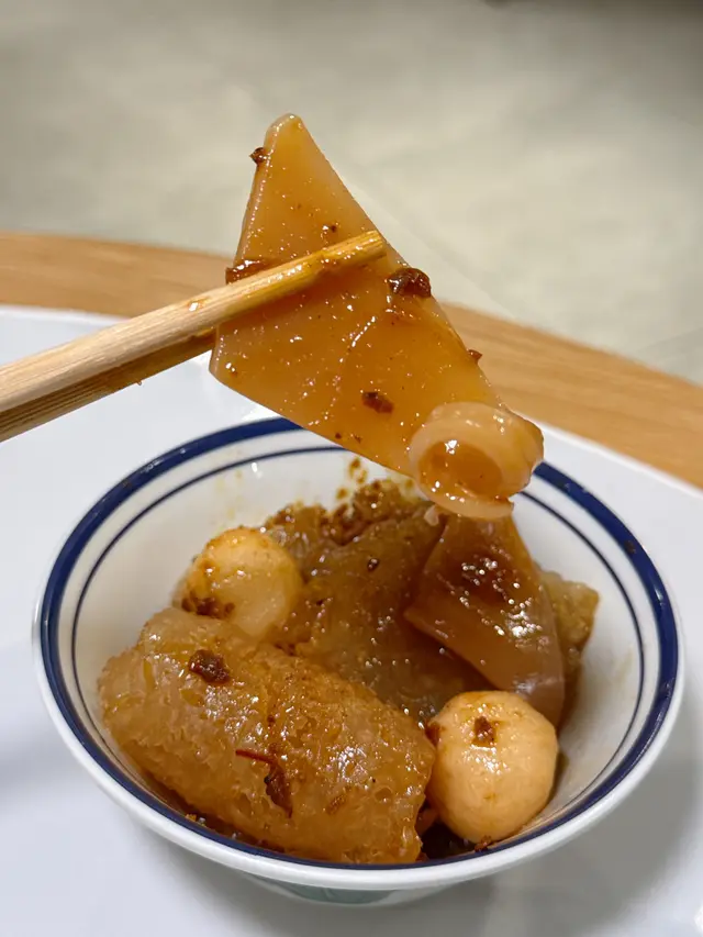 沙嗲醬香濃帶微辣🥜三寶包括魚蛋豬皮蘿蔔 每款都吸盡沙嗲精華