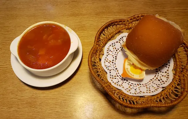 牛柳餐配備餐湯和麵包,很多蔬菜的羅宋湯,酸酸甜甜,很開胃 ; 暖暖的麵包沾上牛油一起吃,用來配搭羅宋湯就最適合。