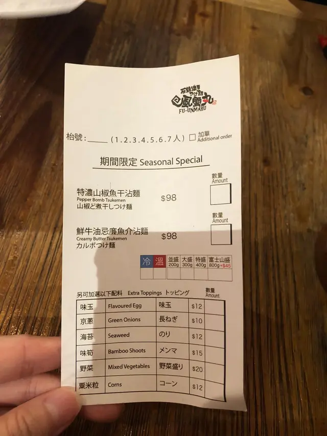 我地可以揀麵既份量 : 並盛 200g/大盛 300g/特盛 400g / 唔收附加收費 富士山盛 800g (要加 $45).