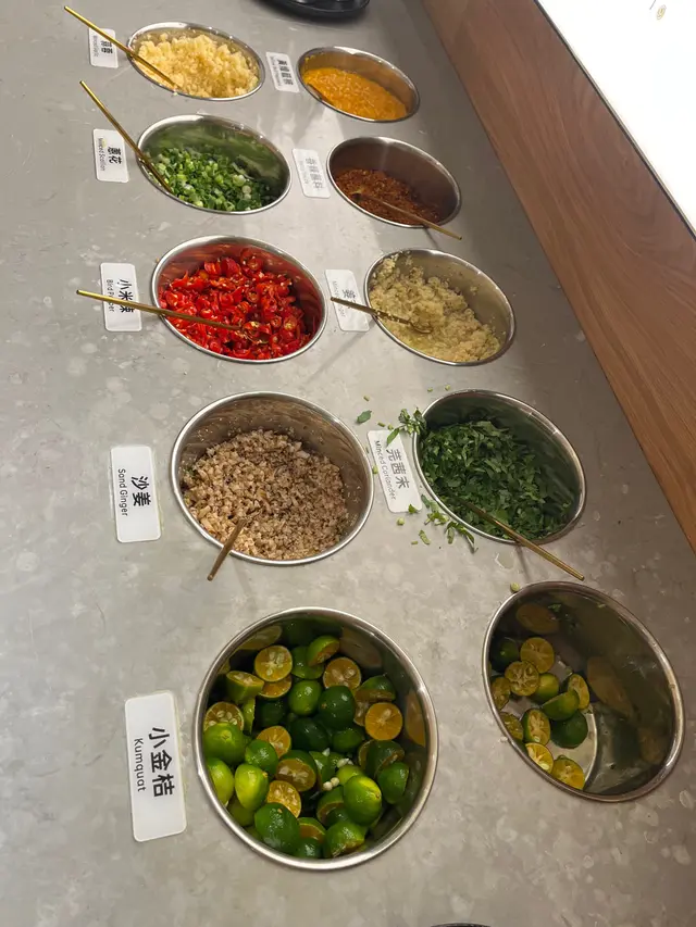 自助醬料吧有不下十種香料/醬料可以自由配搭,我覺得沙薑+薑茸+蔥+豉油令雞肉更香,而小金桔汁的清新果味原來和雞肉很相配
