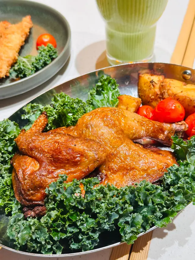 醃料嘅香草同蒜味滲透晒入去,唔使點醬都已經好夠味。旁邊伴碟嘅土耳其香辣土豆好惹味,外面香脆內裡粉糯,辣辣哋好過癮。仲有羽衣甘藍同車厘茄,羽衣甘藍用油醋輕輕撈過,爽口解膩,車厘茄烤過之後更加清甜,成個配搭好豐富