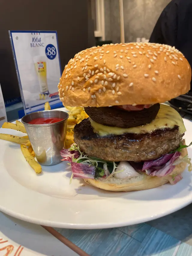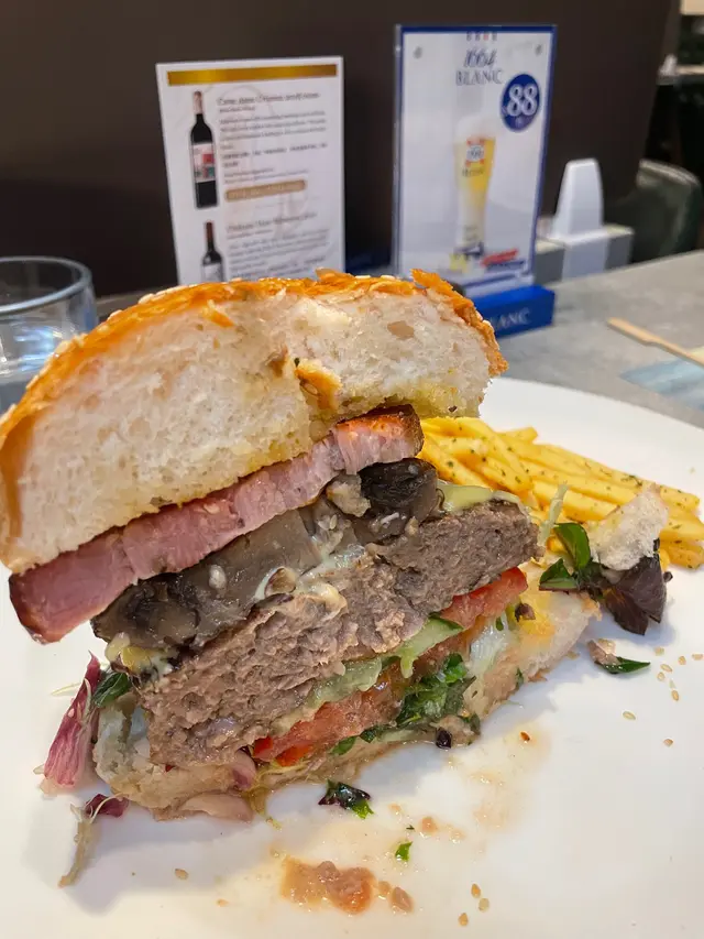 2.出人意表漢堡包,影相冇特別靚,但實物見到非常之驚喜,好厚實,內涵非常豐富,煙肉係厚煙肉,所以特別香同有口感,牛肉多汁,唔會太肥膩,醬汁惹味帶有少少甜,中間仲夾咗菇,實物非常之高,真係要用隻手夾實嚟食,呢個價錢嚟講性價比非常之高!