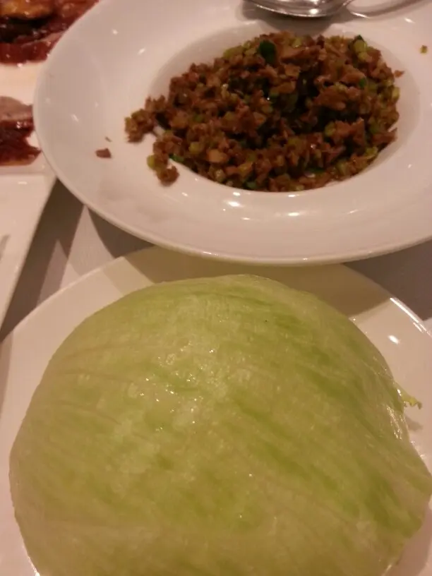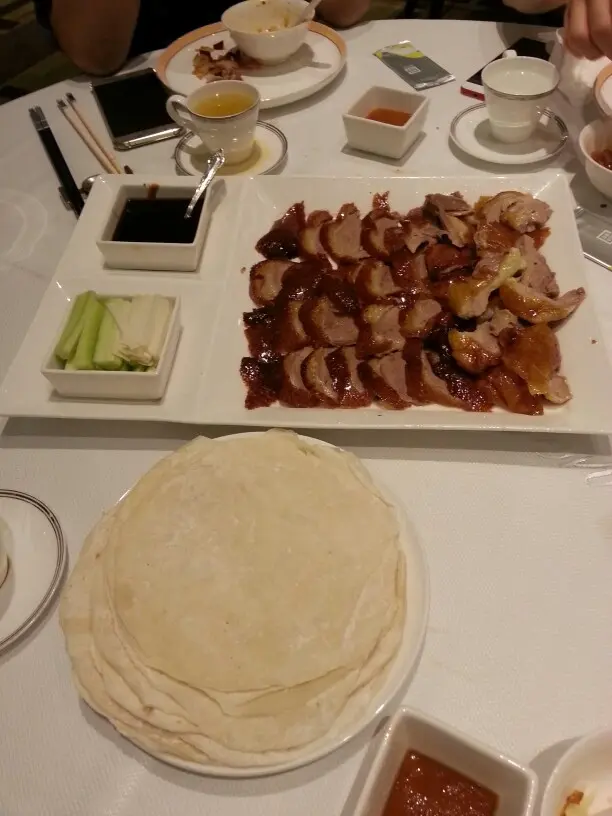 片皮鴨令人失望,太肥腻,我看着女侍從膠袋倒出伴食餅皮放在碟子就上桌,又乾又硬,食店对於處理此菜式完全欠缺誠意,餅皮應蒸軟熱才上桌供食客享用。利用咸菜炒鸭崧味道太咸,差强人意。