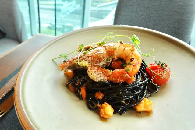 擺盤方面,有乳化過後的細緻泡沫在意粉上,為整碟意粉添上了一抹藝術氣息🎨,意粉的熟硬度恰到好處,口感爽彈,有墨汁香氣,意粉中還夾雜著蝦粒、蕃茄粒和菇類,味道和口感上更有層次,紅蝦有2大隻,亦鮮甜~