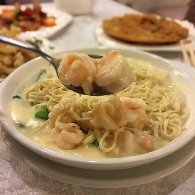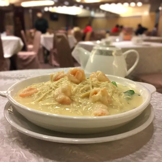 香港隆重場合經常會點選的菜式,伊麵寓意婚姻像伊麵的長度連綿不絕,永無休止,還有大隻肉厚又鮮味爽彈的原隻蝦肉,香濃芝士醬汁,份量驚人。