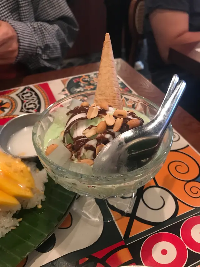 擺盤十分精緻,斑蘭雪糕有清香嘅味道,下邊配有椰果、椰奶及糯米等等,非常好味