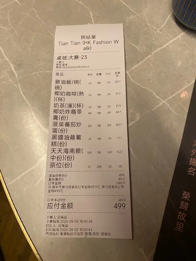 最後呢個天天海南雞,雞肉嫩滑,肉質鮮甜,切得整齊,配上特製嘅醬汁,味道更加出色。醬汁有啲微辣,令雞肉更加入味,配上白飯食,真係一流。每一口都令人感受到海南雞嘅獨特魅力,食完之後真係好滿足!