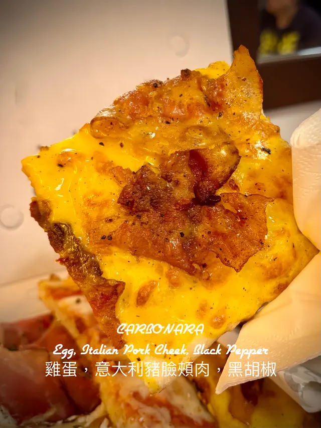 以經典羅馬 Carbonara pasta 為靈感,將creamy 蛋香、鹹香濃郁嘅 guanciale 同黑椒帶上薄餅。